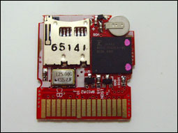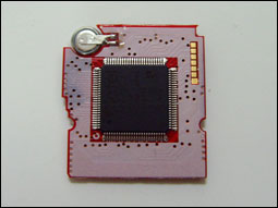 正面带有一个Japan的芯片,下面是两个很小的记忆芯片。(根据资料,每个2Mb的存储容量。因此SC-DS具备4Mb的存储芯片。)背面则是Actel韩国产的读写芯片。另外,右上角有一个电池。看来SC在技术上仍然还未能达到正版卡的完全水准?或者是这块电池另有其用?